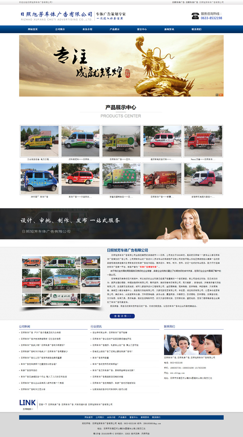 日照旭芳車體廣告有限公司坐落在美麗的濱海城市——日照,公司成立于2008年初,是目前日照唯一一家專業(yè)從事日照車體廣告策劃的廣告公司,公司擁有專業(yè)的廣告設計人員與專業(yè)的烤漆技師【我公司的技師是山東地區(qū)噴漆技能比賽第一名的獲獎者楊海亮親自操作】擁有良好的車身廣告運作經(jīng)驗,提供設計、審批、制作、發(fā)布,改證一站式的專業(yè)服務,致力于打造濰坊車體廣告第一平臺,被客戶譽為“車體廣告策劃專家”。